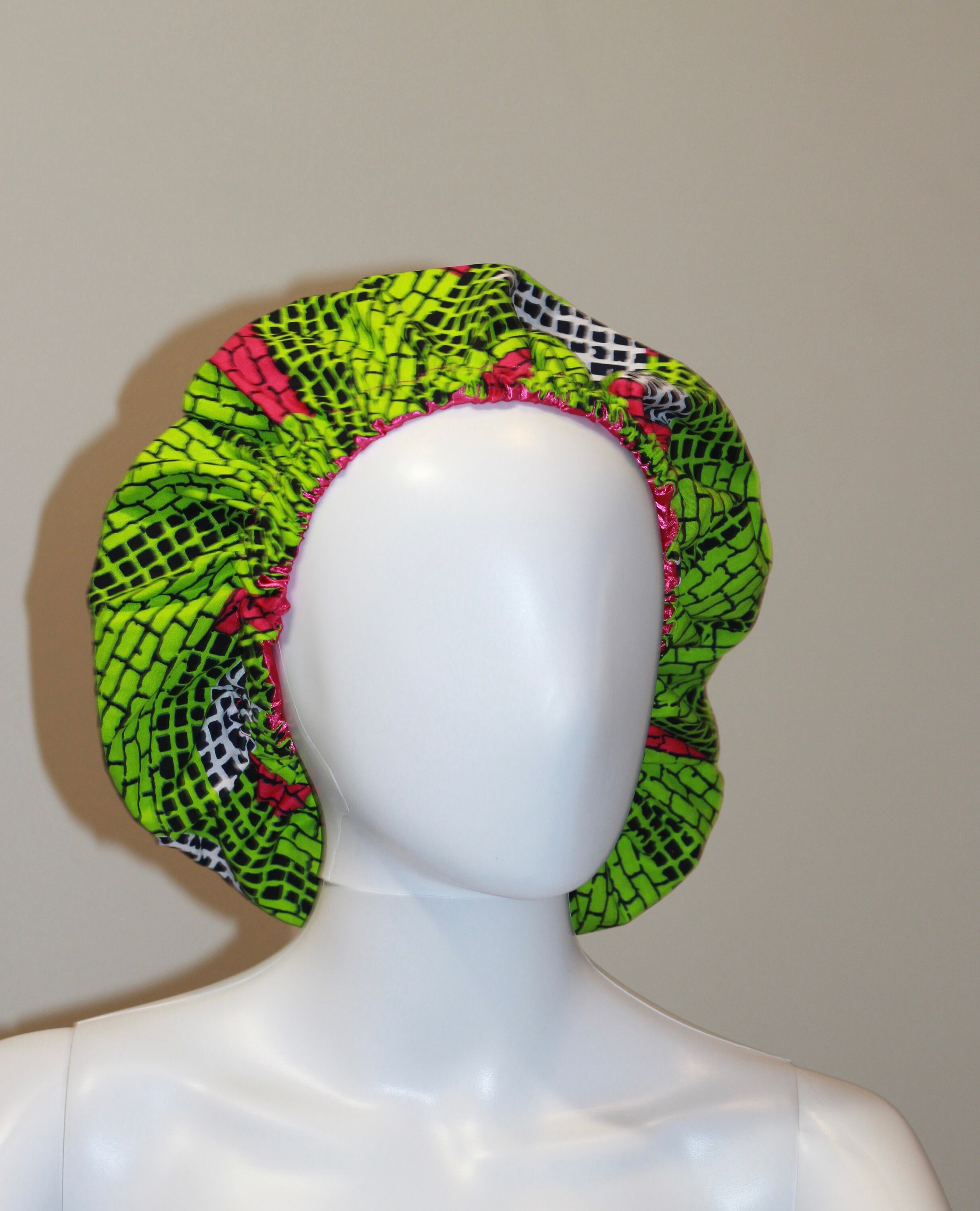 This gorgeous bonnet is handmade with love from a bold African print fabric delicately pieced with a feel good silky fabric for the maximum protection and comfort of your crown… it is reversible and absolutely catchy!!