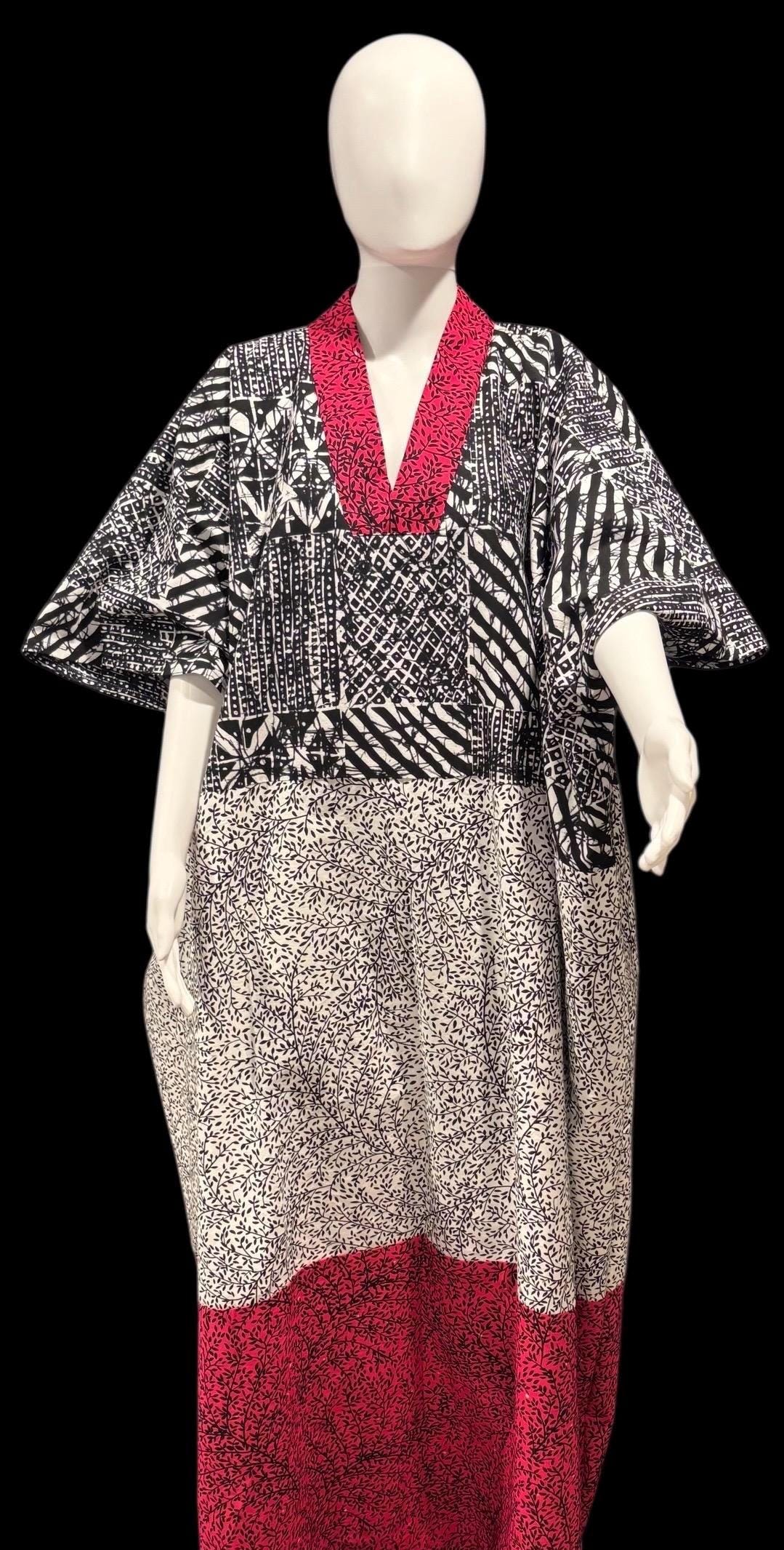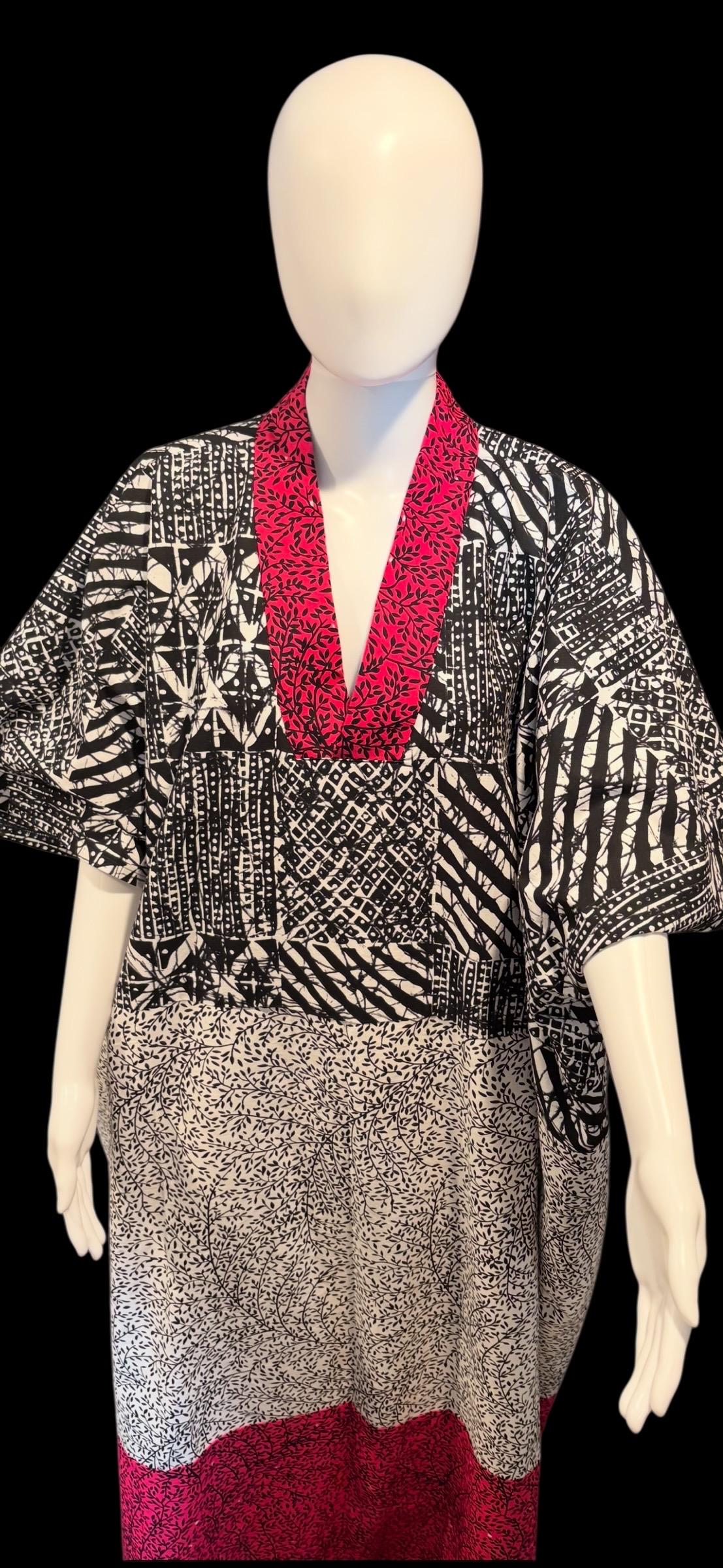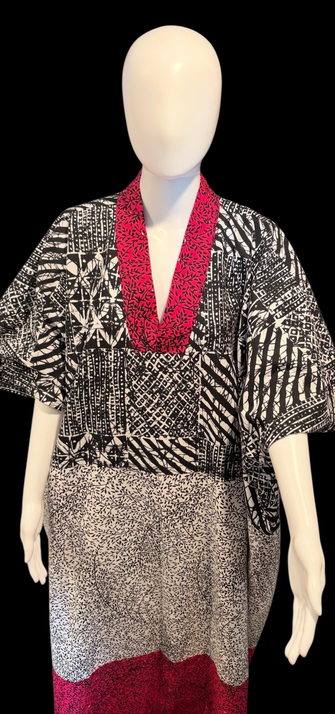 Patchwork Kaftan is a mix of 3 beautiful African Print fabrics. It is versatile & has a tie rope on the inside for a snug fit (if desired) to accentuate the waist and bust area only. This dress is perfect for all occasions and has pockets .