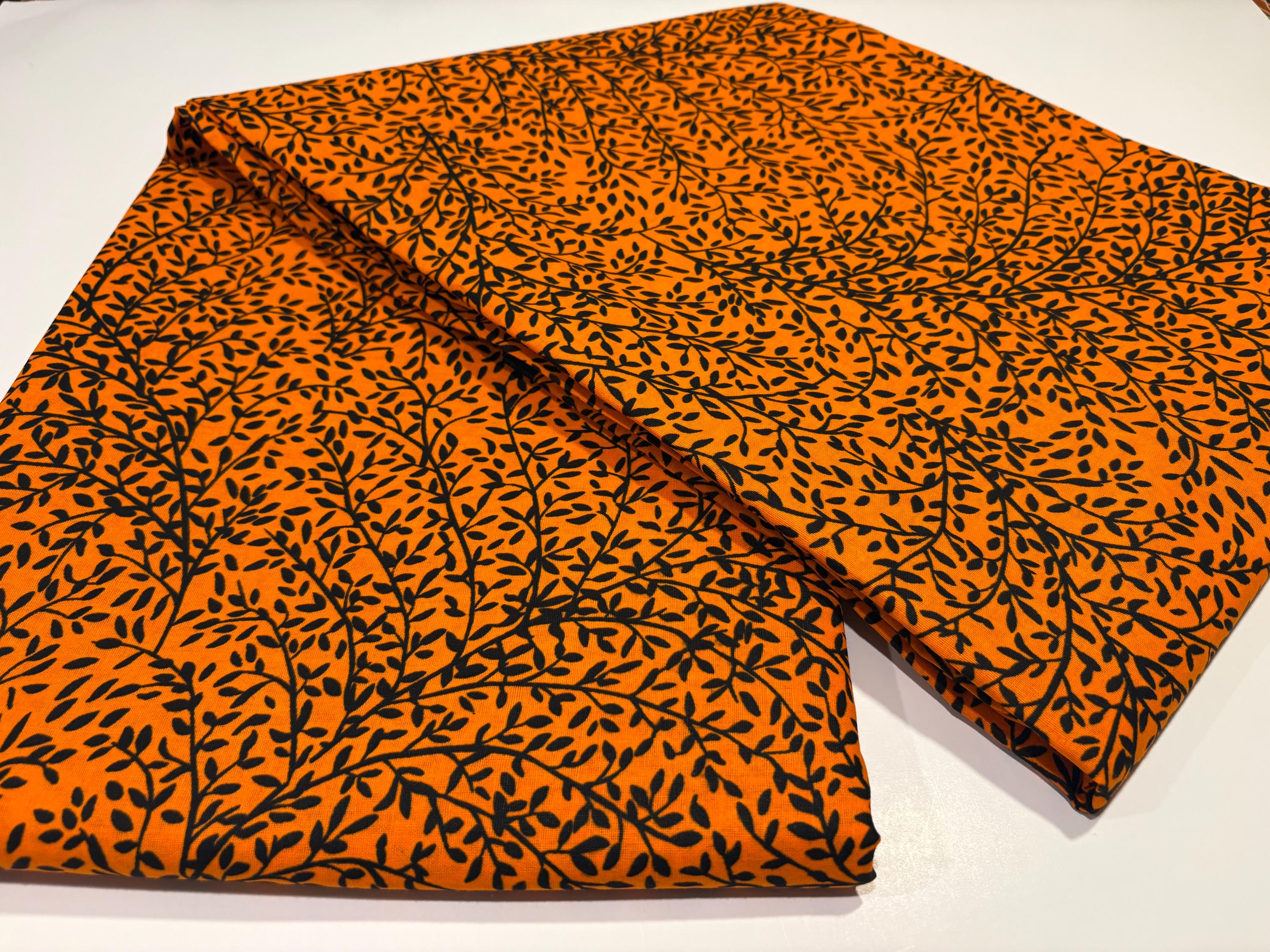 Add this vibrant beauty to your creations,featuring bold black leafy patterns in an abstract form on a rich orange background. Made from 100% cotton, it’s perfect for clothing, accessories, quilting, and home décor. Soft, breathable, and easy to work with this fabric brings both tradition and modern flair to any project. A definite must have!!